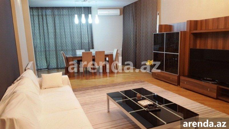 A comfortable 4-room apartment with total area of 200 square meters is available for renting near the Aquapark on Rashid Behbutov Street. 3 bedrooms, 2 bathrooms with Jacuzzi and a shower with expensive repair in modern style. The kitchen is built-in and fully equipped. Washing machine and dishwasher. Individual heating system. The rooms are very light and wide. The apartment is with panoramic windows and a large balcony of 17 square meters. Heated floors. Very comfortable layout. There is the sports complex "Aqua Park" near the house, which includes a gym, a restaurant, a sauna, a swimming pool, a beauty salon and a large supermarket that operates 24 hours a day. The building is guarded 24 hours a day. The apartment is located 5 minutes’ walk from the business center of the capital. The rental price is 2500 manat per month. The apartment is also rented on a daily basis 150 manat per day.